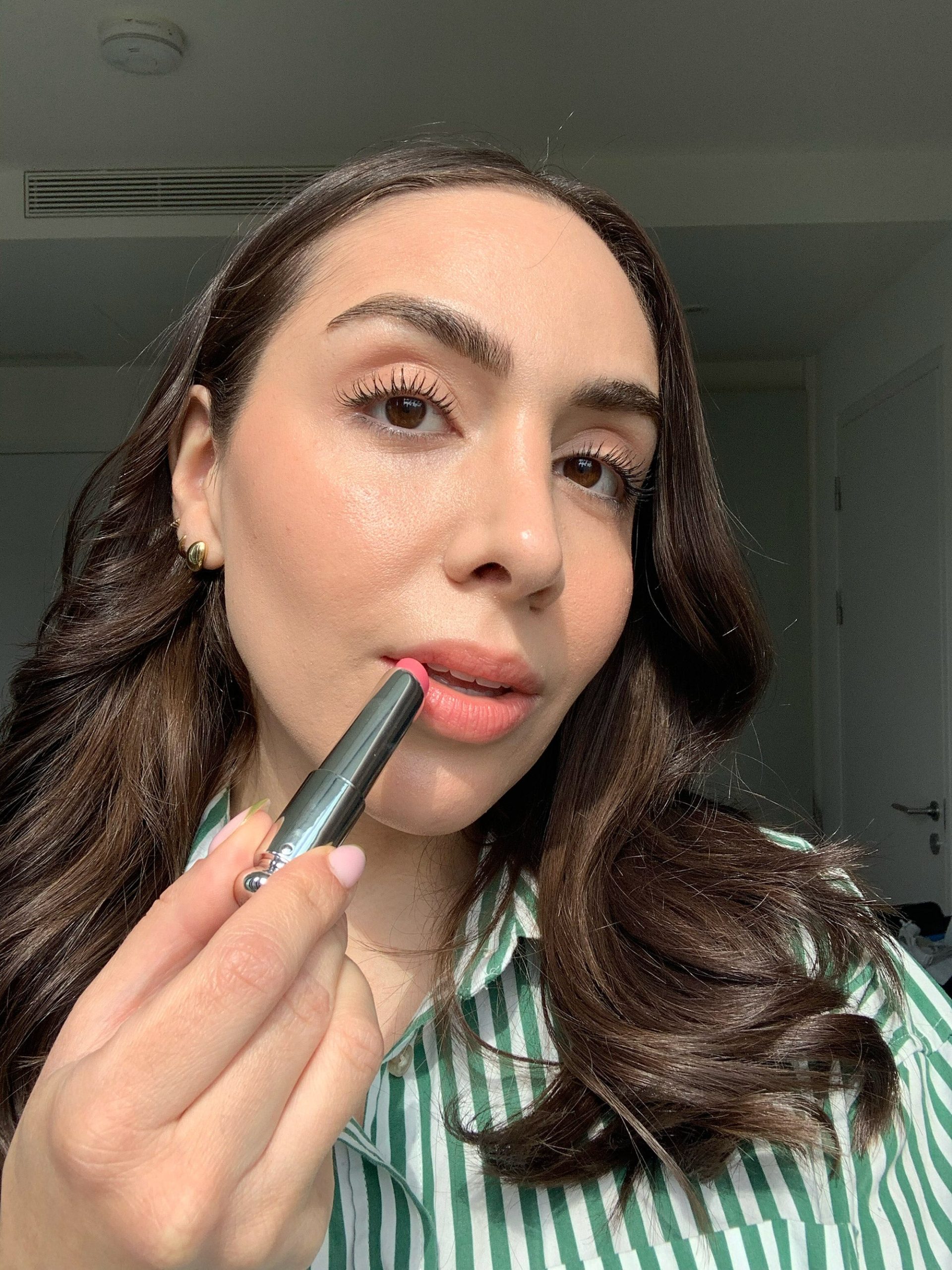 “This formula is ultra hydrating, leaving my lips feeling and looking soft and glossy for hours after application, like a true balm. The pigment does lean on the sheer side, but it’s designed to be layered, meaning you can opt for a simple wash of pigment, or build it up like I have done here with the shade Banter, a bright, reddish pink. As someone who usually hates the feeling of lipstick, this is the perfect alternative, especially on days I want to rock a red lip.