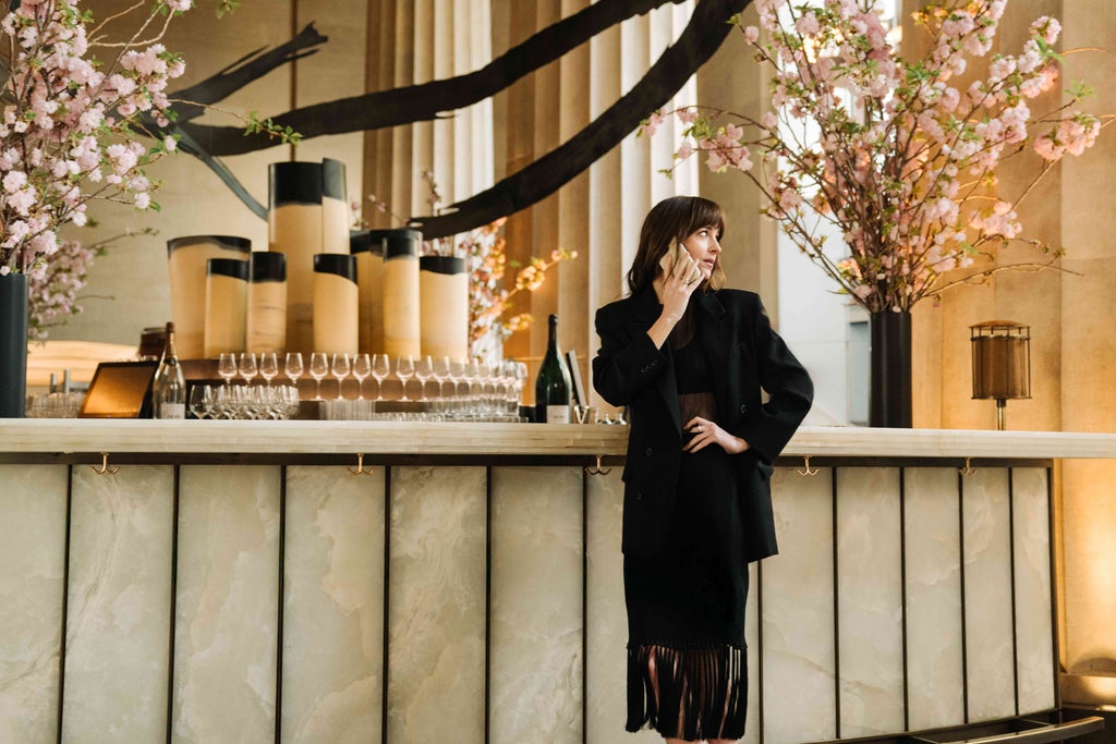 When a previously skeptical Lucy agrees to go all-in with Harry, she elevates her signature black monochrome with a sheer Simkhai top, layered over an Only Hearts bra, and a vintage double-breasted blazer. Her knee-length Another Tomorrow skirt, with dynamic tasseled fringe (a more fun take on the business-like skirt she wears earlier in the film), takes on a life of its own as she and Harry do a dance of sorts through the hallways of his sprawling $12 million Tribeca penthouse.