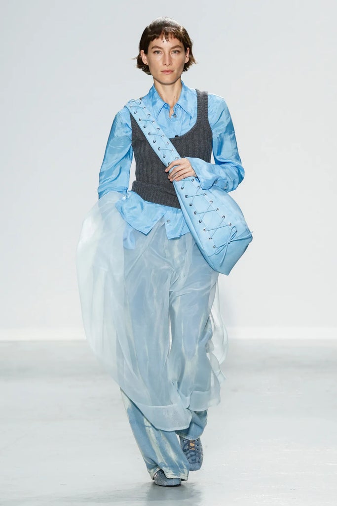Slightly brighter than early spring’s baby pinks, cotton candy tones are having their moment. From nostalgic ruffled gowns to power suits, the darling hue balances whimsy and structure — equally fitting on a puffed sleeve top or a platform sandal. Look out for smaller pops via pink accessories, too (think silk headscarves and mini bags).