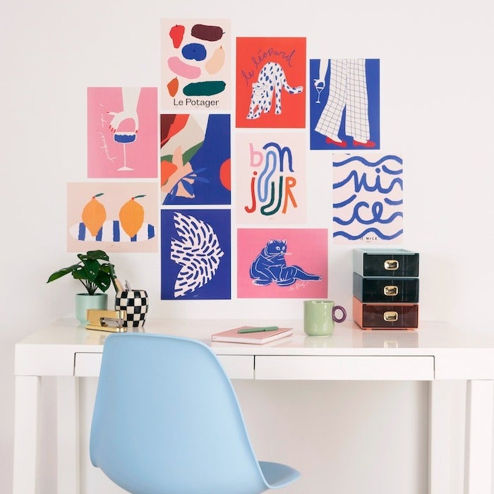 The simplest way to amp up your blank walls? A gallery wall of big, bold shapes, quirky, playful sketches, and striking block colors.