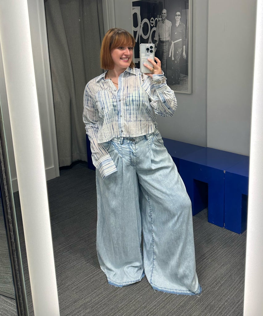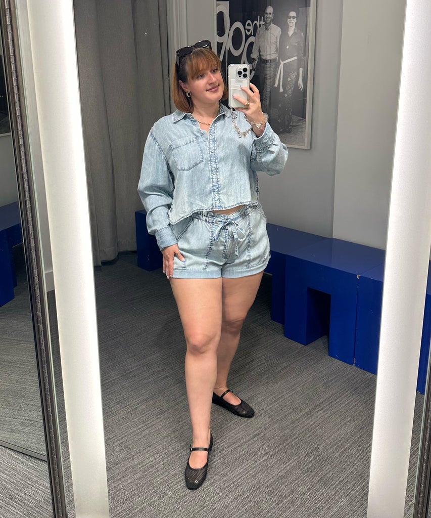 I did also really love the sheer cropped button-down, which, for some reason, made me feel like Lizzie McGuire. With the cuffs rolled up, it brings a cool, coastal vibe to an office staple. I paired the similar drapey denim button-down with matching high-rise denim shorts, which have a paperbag-type waistband and super-stretchy fit. I preferred these over the collection’s Low Rise Stride denim shorts, which are a bit more rigid and revealing.