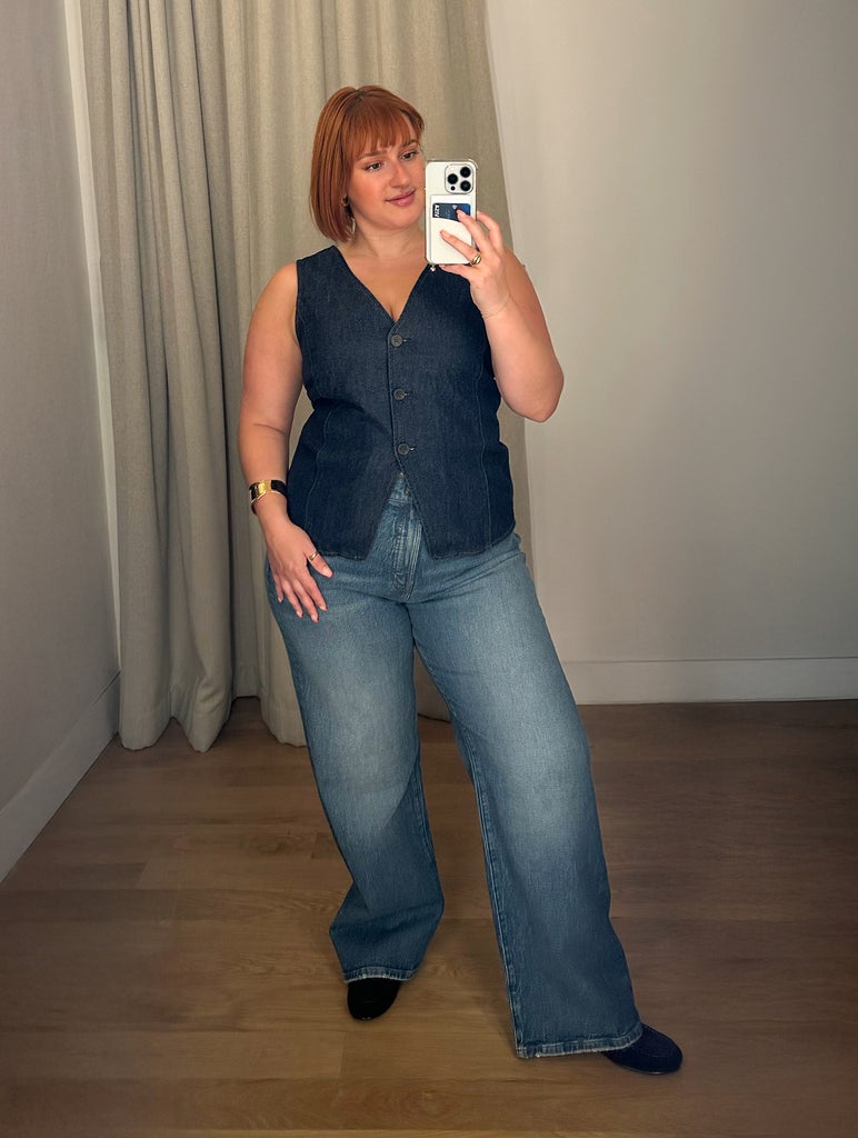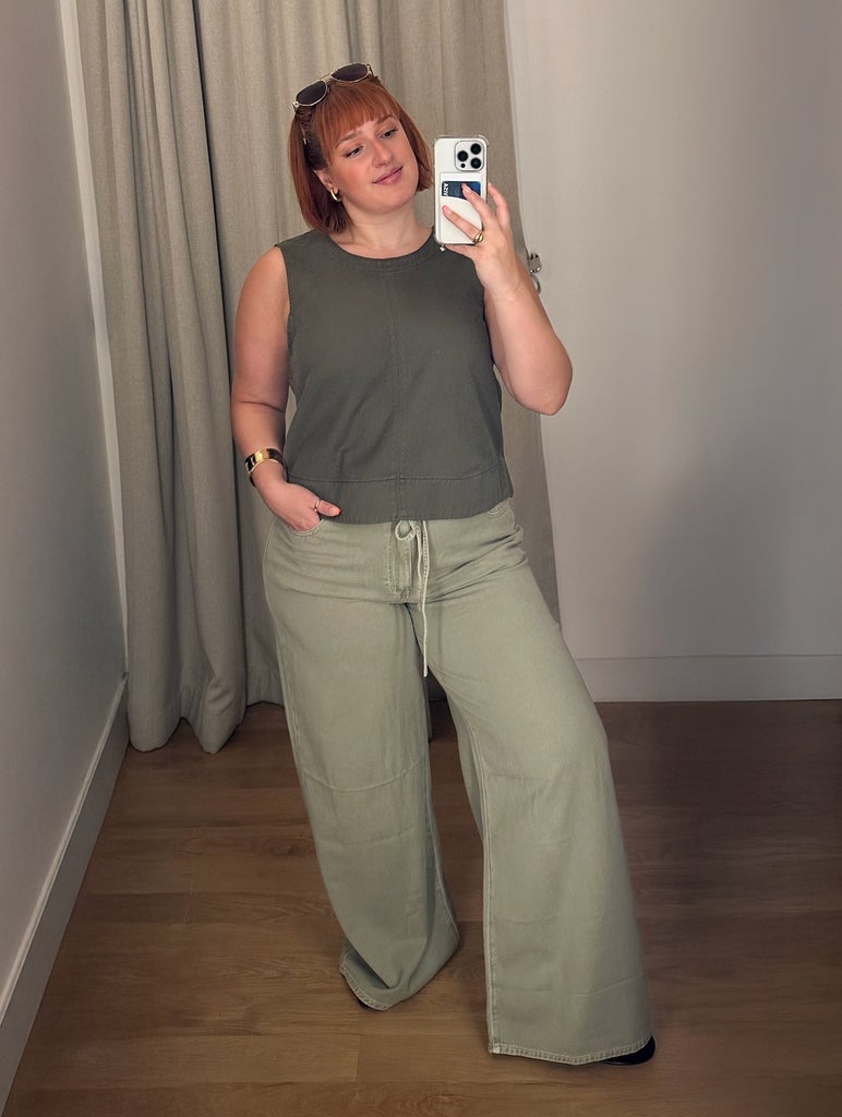 I also have to highlight the Superwide-Leg Jeans for several reasons: the sage color is a refreshing alternative to the usual sea of blue, the drawstring waist adds an unexpected casual element, and the airy denim is supremely drapey and comfortable. While these pants have a matching vest, I paired them with a boxy shell top with a zip-up back — and the color combo is giving me quintessential fall vibes.