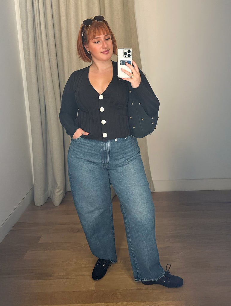 The style that I giddily took home with me was the Curvy Balloon Jean — also available in a striking white wash. It offers a more subtle curve than a horseshoe or barrel jean silhouette, which makes it incredibly versatile to style. These can be dressed up or down, but I went the casual office/weekend route with a ribbed cardigan (the iridescent buttons are so good) and a spacious shoulder bag dotted with chunky studs.
