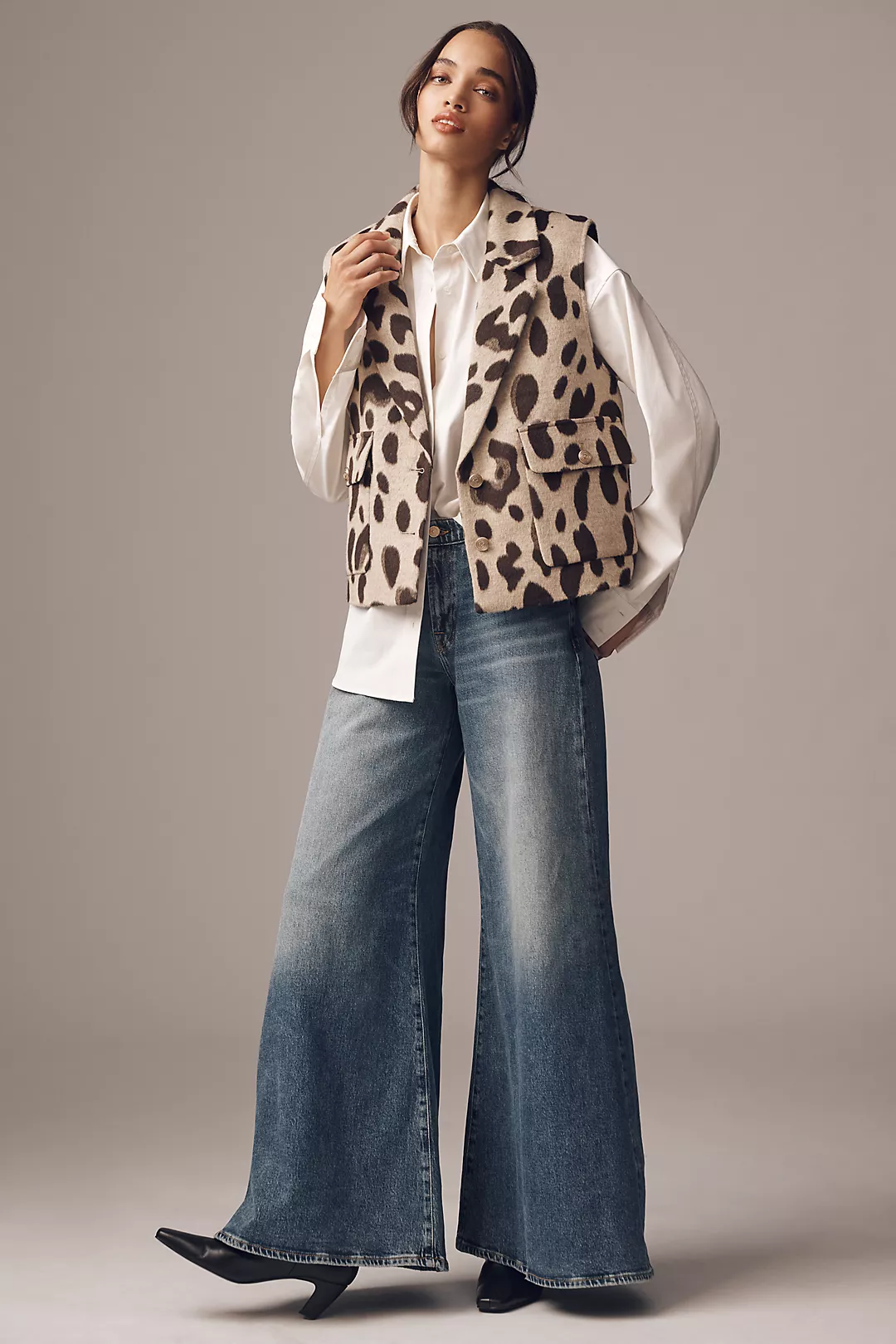 Maeve Enlarged-Leopard-Print Vest Jacket, $, available at Anthropologie