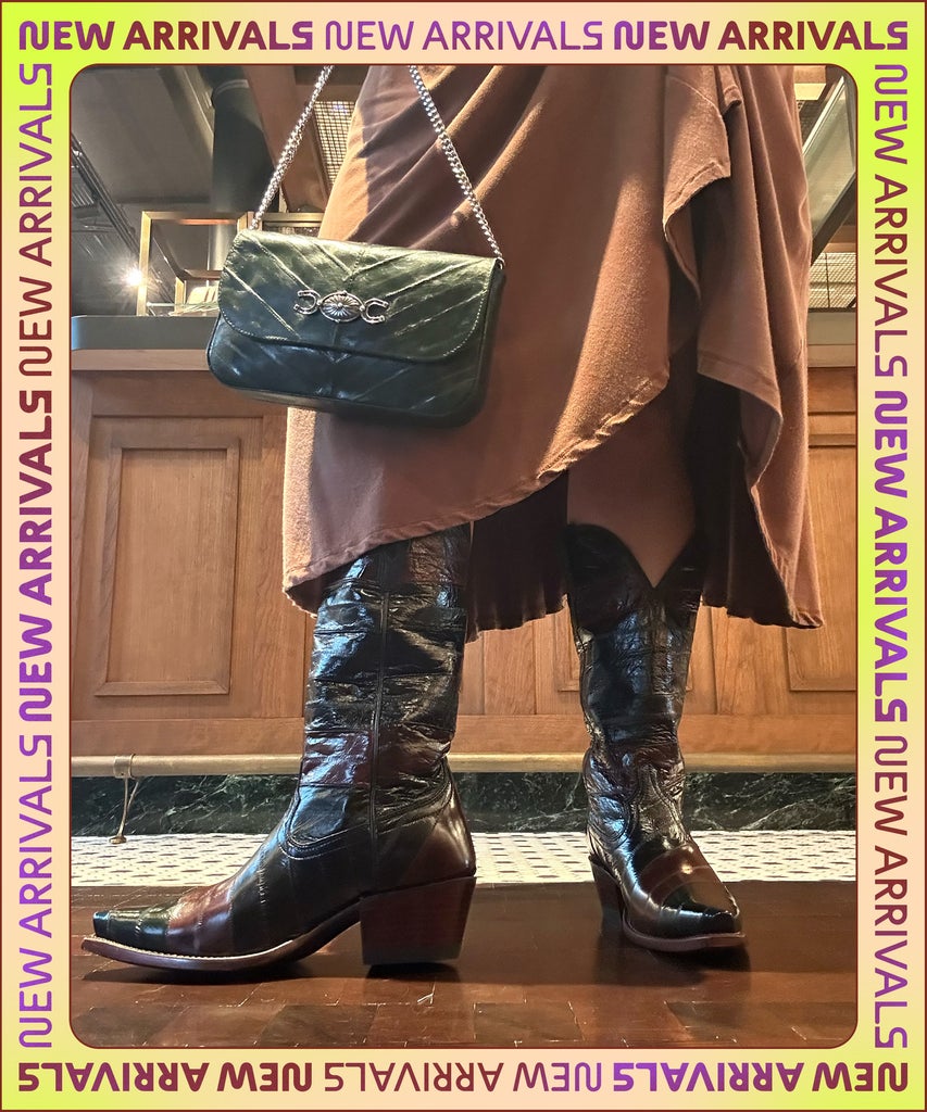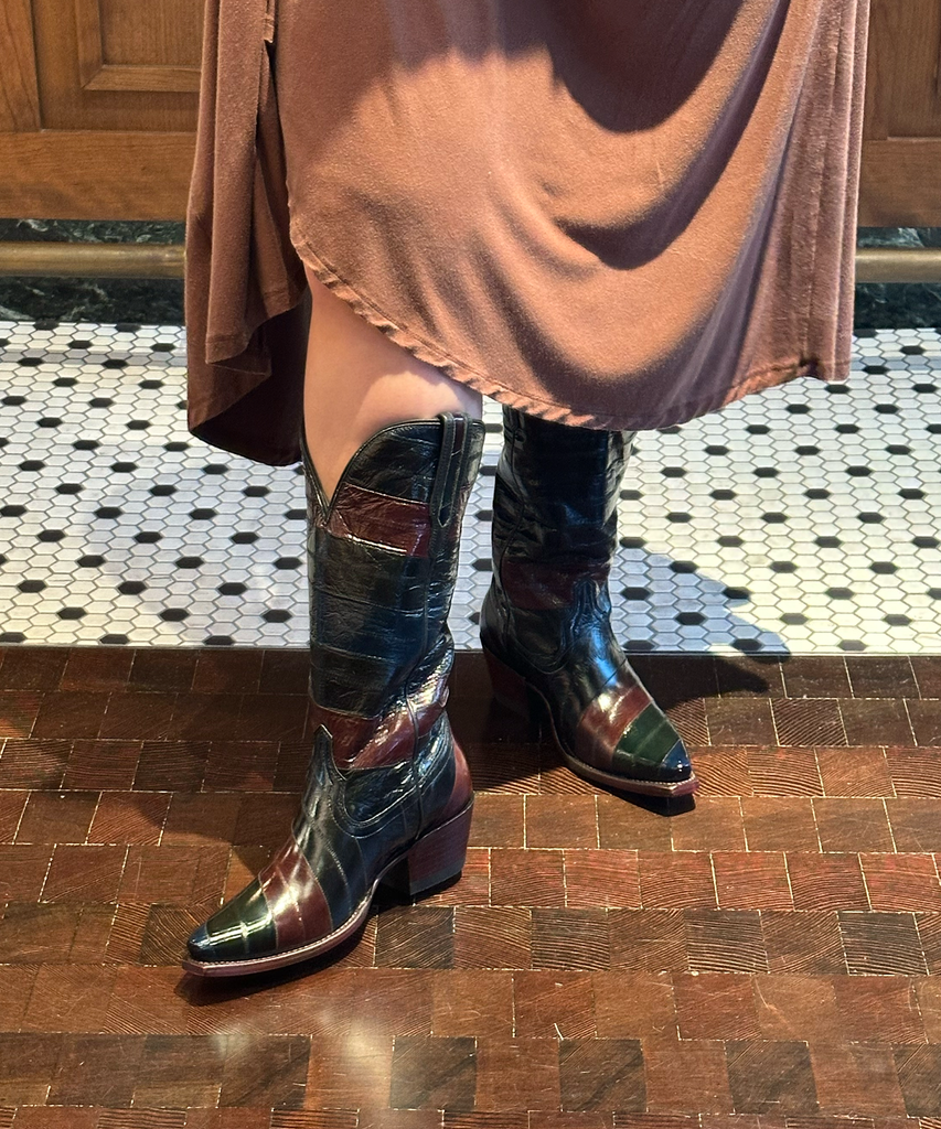 Unsurprising to myself, I was immediately drawn to one of the brand’s most expensive boot styles. The Annie boot is a bestseller that typically ranges between $345 and $365, but the limited-edition, color-blocked eel leather costs a pretty $595. The shiny leather and rich colors are very luxurious, and pair perfectly with the brand’s new eel Concho Clutch for special occasions.