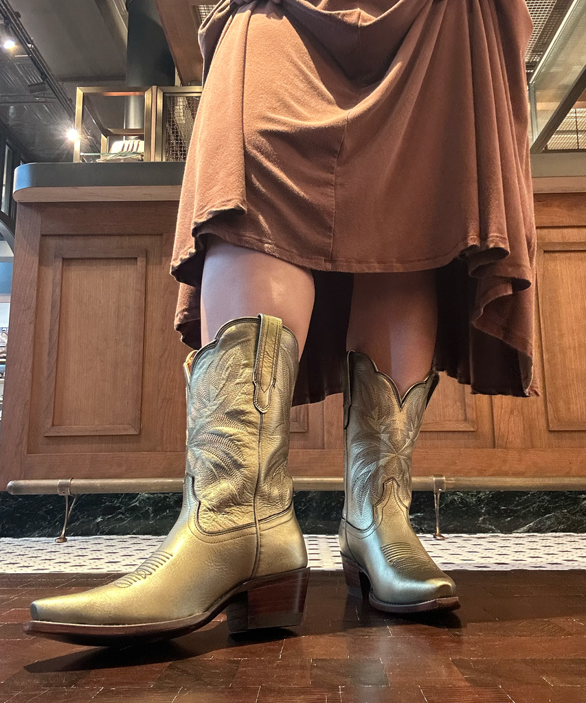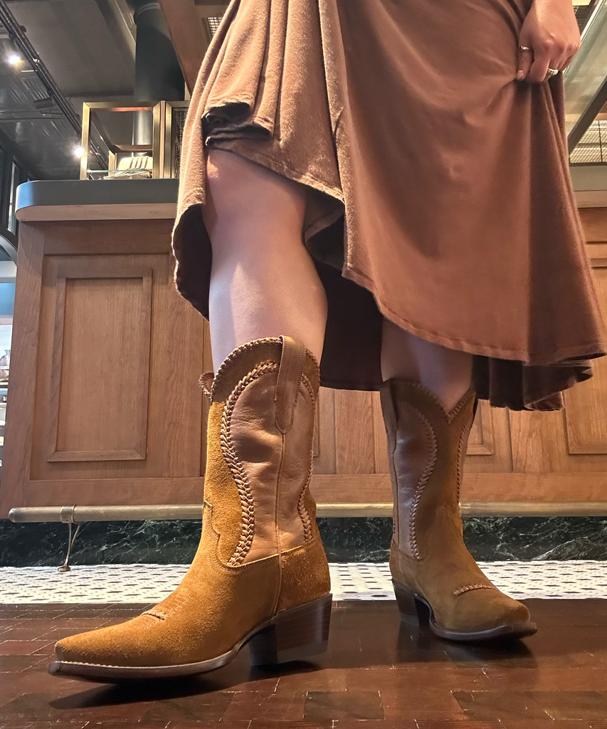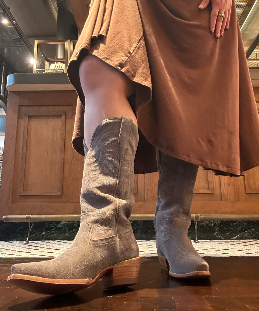 Now, onto the boot I couldn’t wear: The Abby. I generally have to order wide-calf boots for myself, so I was skeptical about trying the brand’s knee-high and over-the-knee styles. While The Annie is offered in wide-calf options, others are not, so I couldn’t quite slip The Abigail all the way up. But pro tip: every Tecovas store offers free boot stretching. I witnessed this service in person when a worker stretched the shaft of a boot up to an extra inch wider. This is a huge perk if you’re able to make it into a store so that your boots fit perfectly.