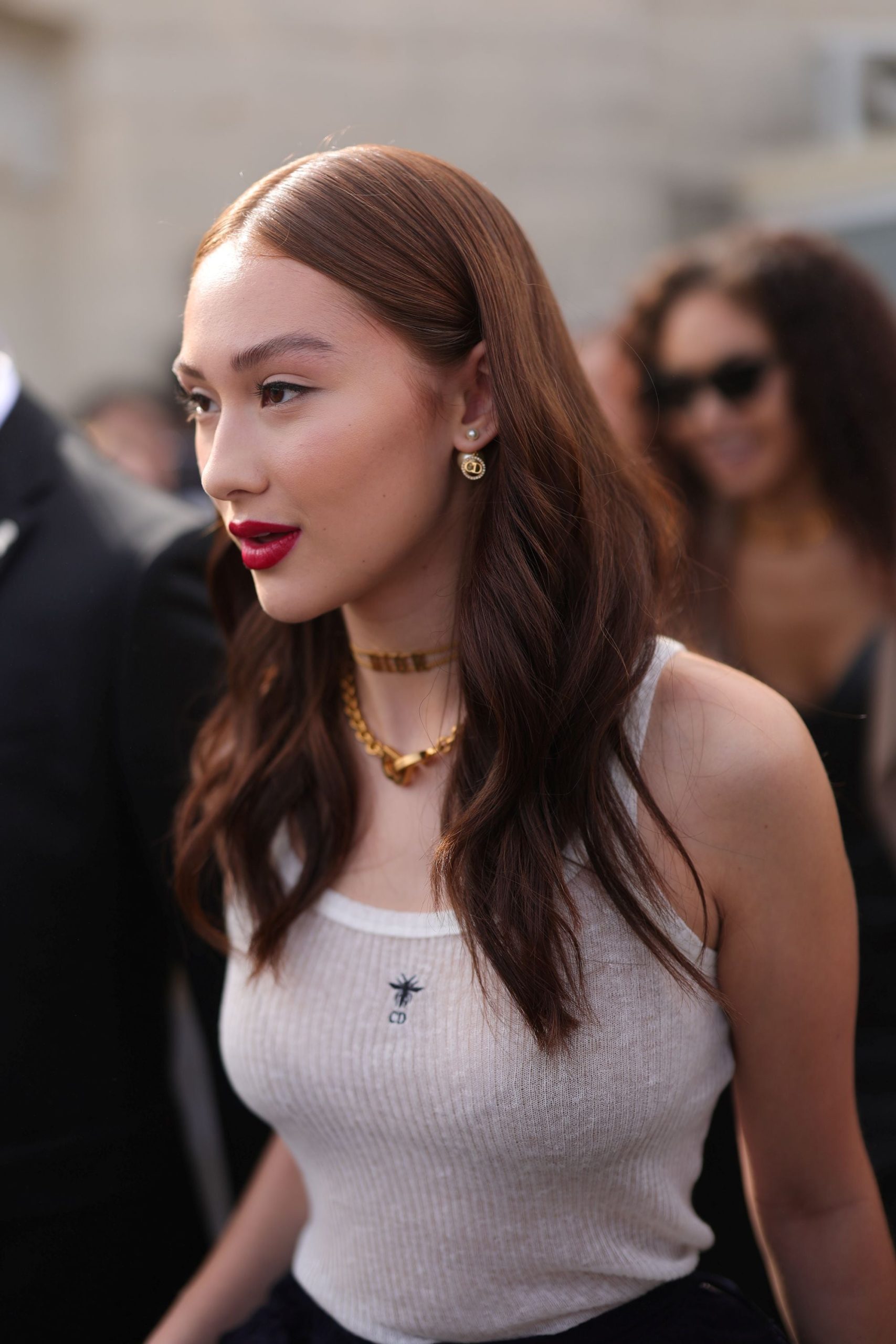 Lola Tung is a natural redhead, and this simple mid-length hairstyle for Paris Fashion Week in 2023 showcases the vibrant colour. A middle part with subtle waves is easy to recreate at home, as well!Photo by Jacopo Raule/Getty Images.