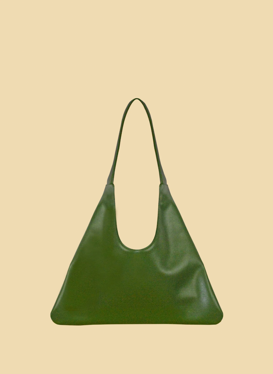 Sustainable and timeless, the Agave Triangular Tote in Green is perfect for the cooler months. Its triangular silhouette and structured body make it both visually striking and practical, while the rich forest-green cactus leather adds a warm, autumnal touch. The spacious interior, secure top handle, and minimalist aesthetic make it ideal for layering with cozy fall outfits, like oversized sweaters and tailored blazers.