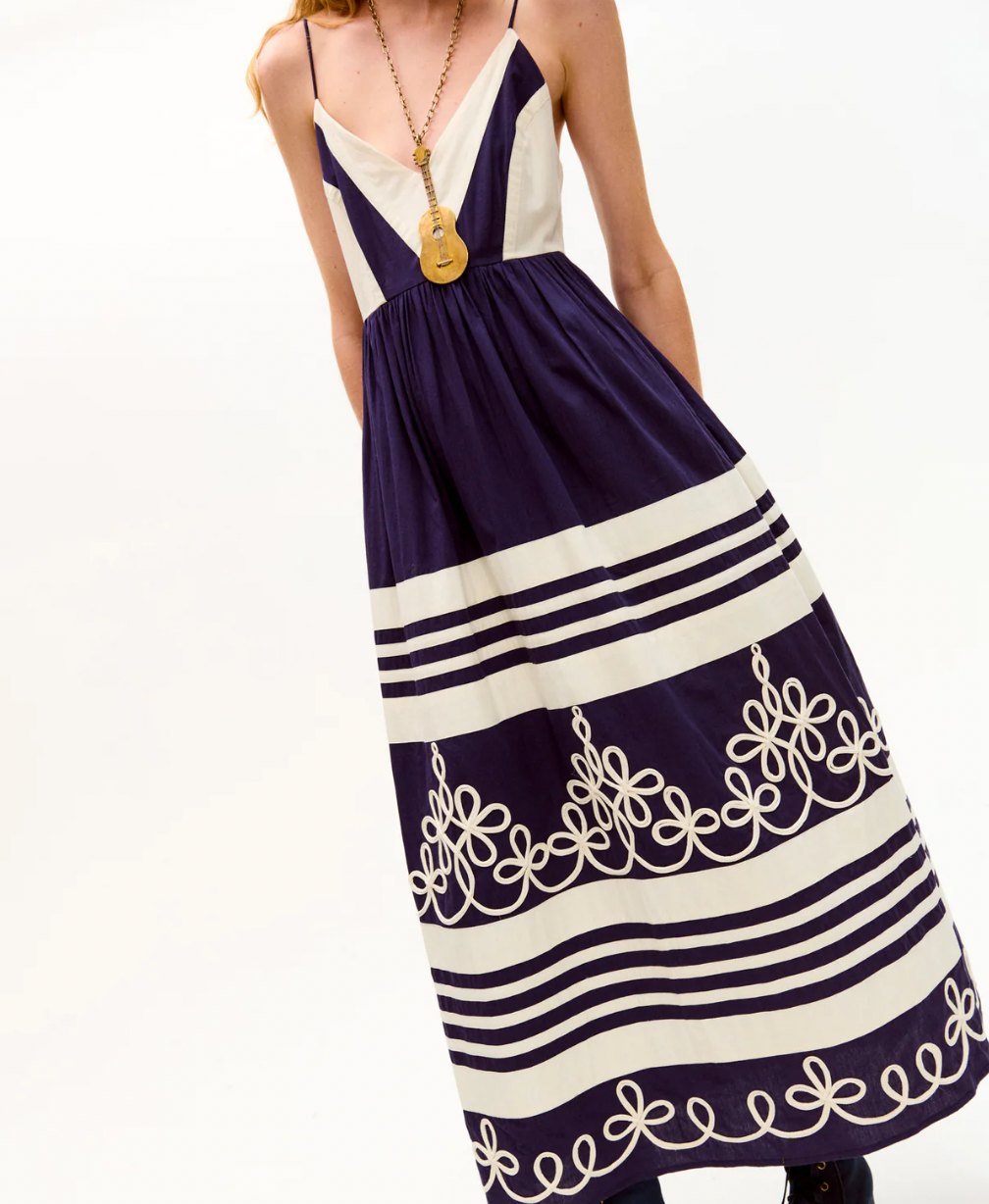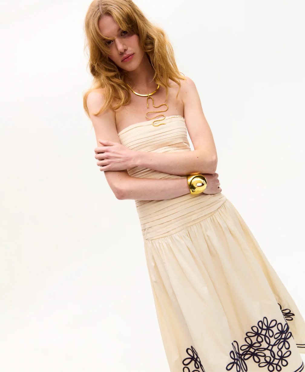 This 100% organic cotton strapless ivory midi dress features a ruched bodice and a full skirt, giving it elegant volume and movement. Meanwhile, delicate navy soutache-embroidered floral motifs and a striped hem subtly evoke the Andean landscape.