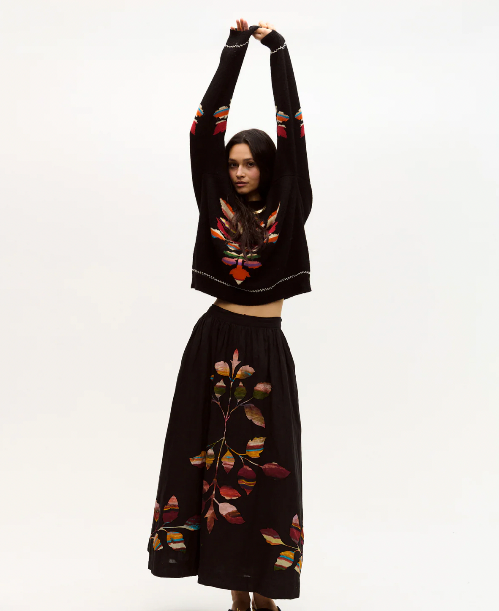 This black high-waisted midi skirt features a bold multicolor botanical motif with hand-painted leaf details in rich red, orange, and blue tones. It’s timeless, cozy, sophisticated, and stands out without shouting.
