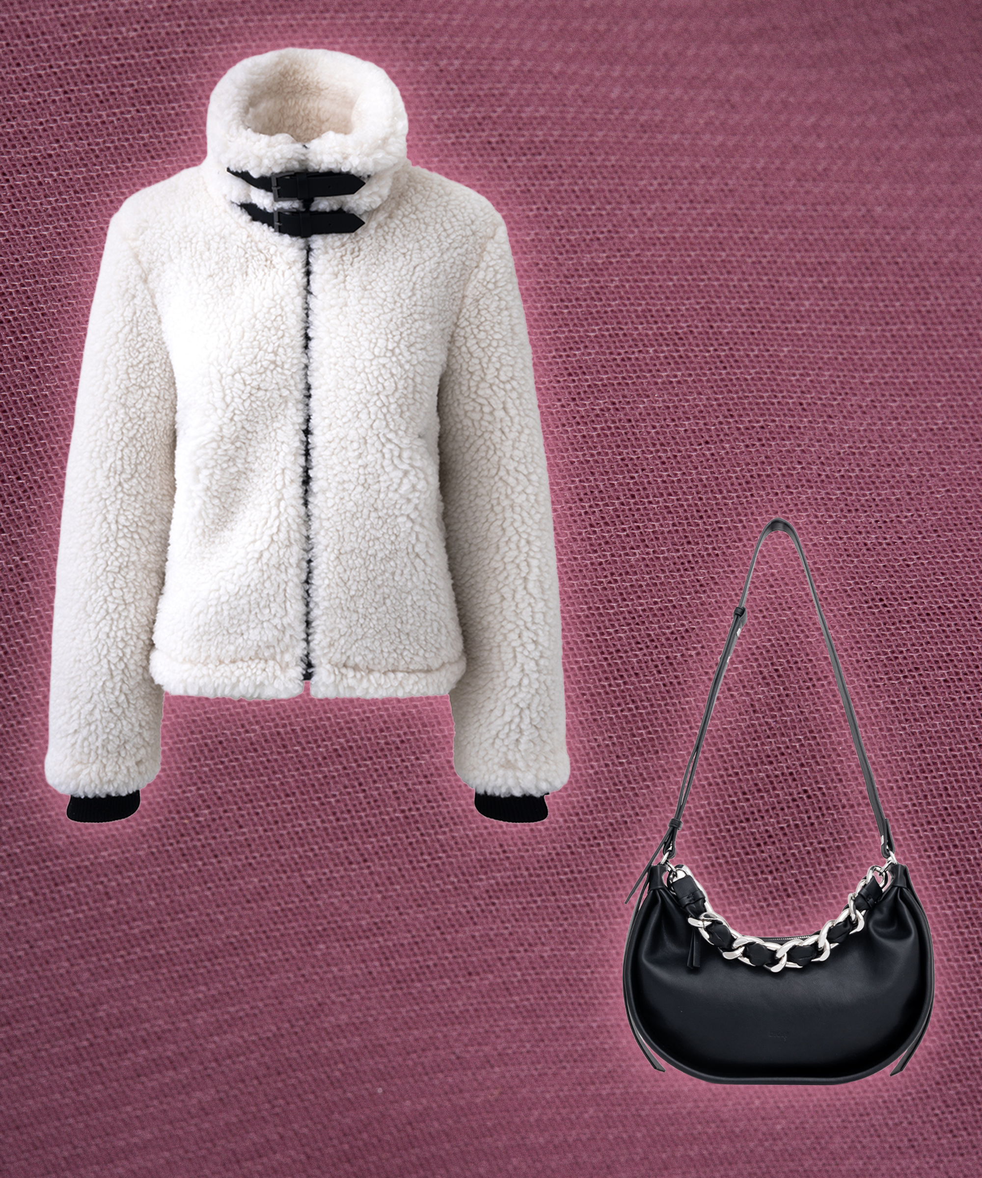 She’s the one who owns at least eight loungewear sets and believes coffee runs count as an outing. This snuggly sherpa coat with buckle details delivers full-on plush energy (essentially doubling as a fleece blanket), while the slouchy chain bag adds just enough edge to balance softness with structure. It’s that irresistible mix of tactile and cool — cozy textures paired with sleek hardware that make every errand feel considered.