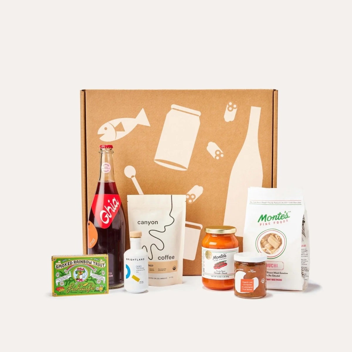 The ultimate host gift, this box is filled with foodie favorites, like canned fish from Fishwife, extra-virgin olive oil from Brightland, jam from Sqirl, a non-alcoholic berry spritz from Ghia, and more.