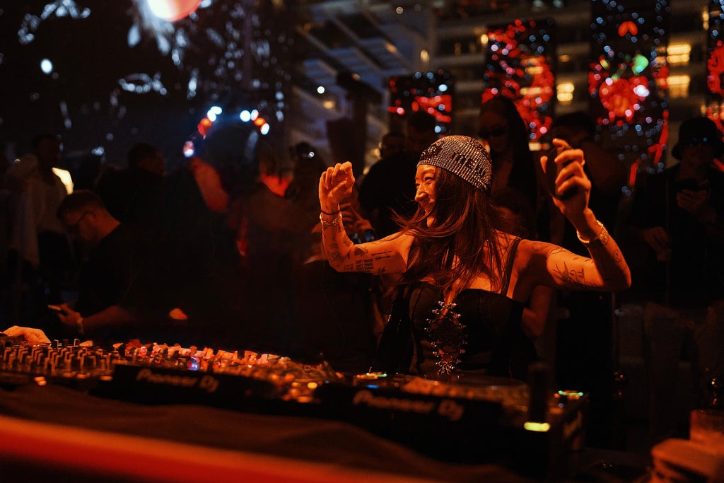It is around midnight at the Playa Pacha Pool and Beach Club at FIVE LUXE JBR in Dubai. German DJ Gerd Janson has just dropped a remix of Stevie Nick’s “Edge Of Seventeen” when Peggy Gou appears next to him, diamond-clad in a Q Park Millinery sparkly bandana, with a cat on the front reading “Mew Mew,” paired with a black two-piece. I am standing behind the decks, watching her slink into the space with her entourage, as the crowd reacts to her presence. Someone next to me breathlessly exclaims “queen”, in a way that seems involuntarily. As the crowd howls in unison and Gou clasps their hands, I am struck by how comfortable she looks.