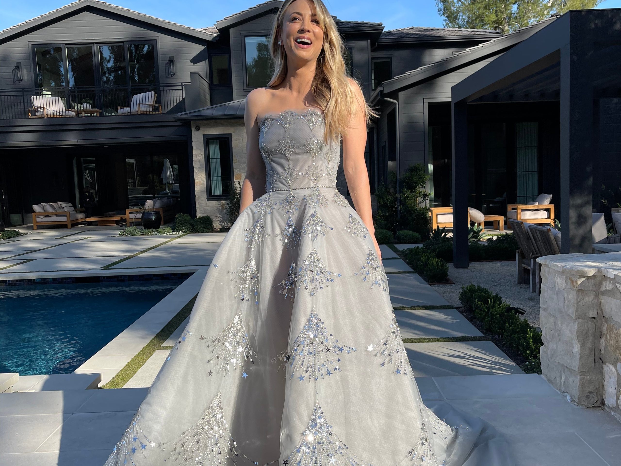 Kaley Cuoco looked every bit a princess in this embellished, silver Oscar de la Renta gown.Photo Credit: Brad Goreski.