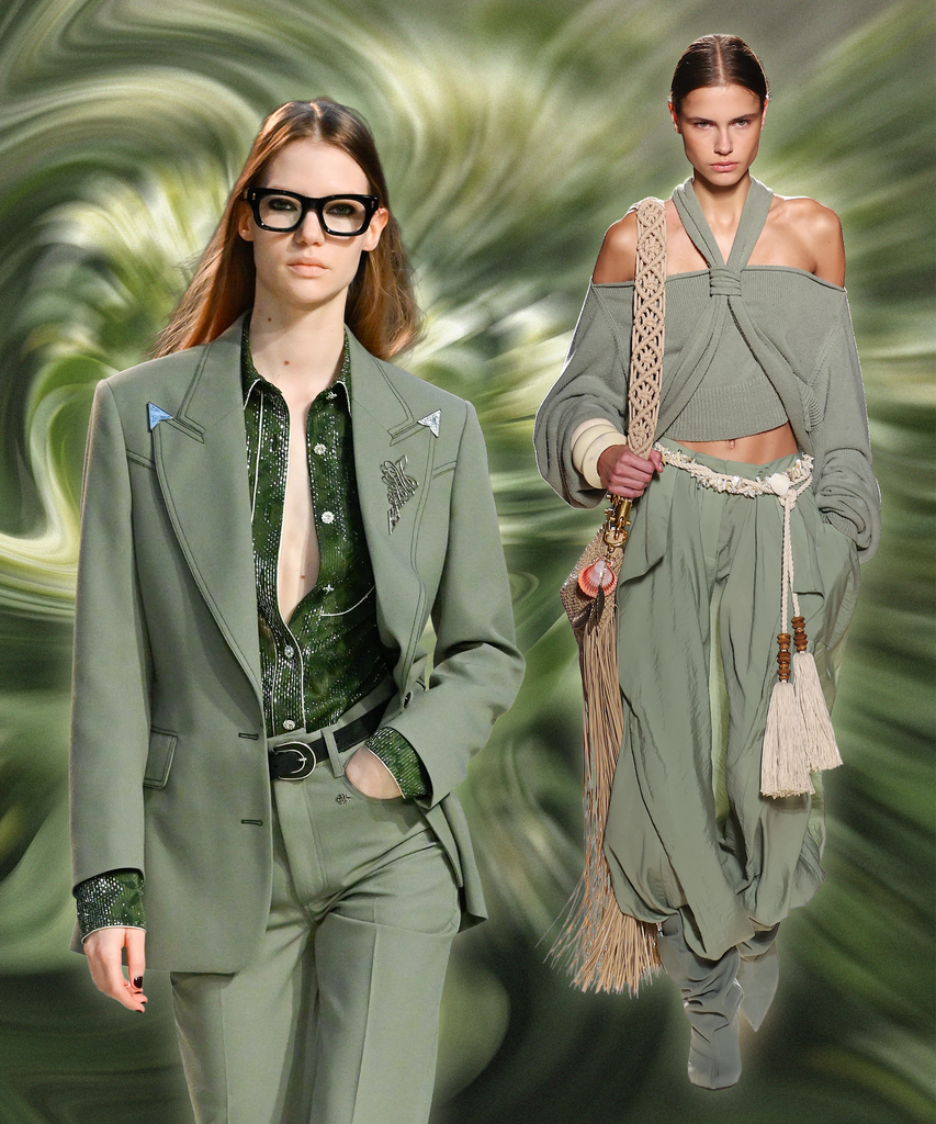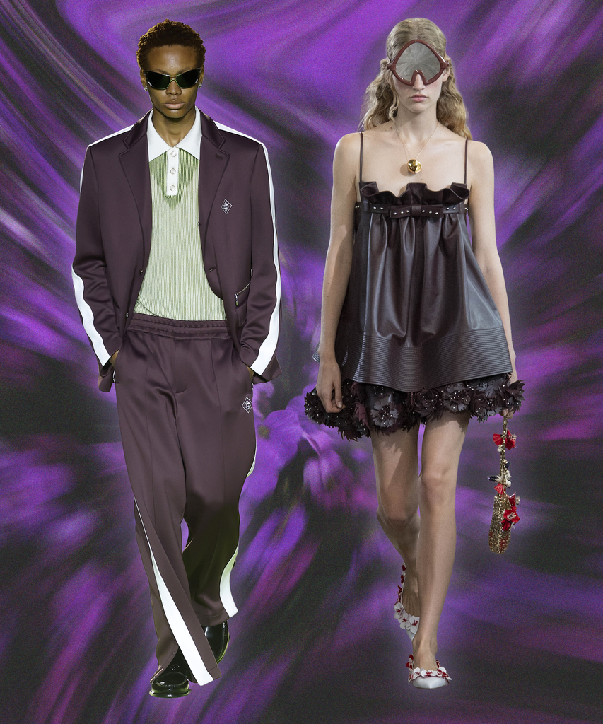 A stark contrast to many of the bright, playful colors on trend for 2026, dark plum noir is moody yet striking, making it a great alternative for those who tend to wear all black. Between the rich suede outerwear from Tom Ford and the romantic goth aesthetic of Rabanne’s pleated babydoll dresses, the deep berry hue has the power to work as both a staple and an accent in your wardrobe. Plus, it pairs well with other standout shades of the season, including electric wasabi and soft persimmon (more on that below).