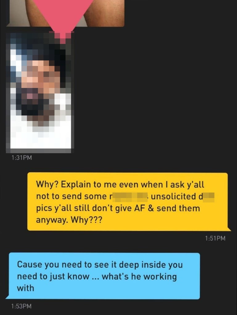 I’ve sifted through hundreds of messages from complete strangers who feel comfortable enough expressing that they’d like to “try me for their ‘first time,’” as if I’m a chemistry set to be experimented with rather than the human being that I am. Forget “Hi, how are you?” or “What are you up to?” as predictable, if boring, openers. I’ve received messages about lurid fantasies without my consent, and have been repeatedly dehumanized and denied intimacy, and told that my life does not matter if not for what my body can do to satisfy cis men’s desires. The number of unsolicited nudes I’ve received truly cannot be counted, despite clear warnings in my bio and in messages to not send such photos.