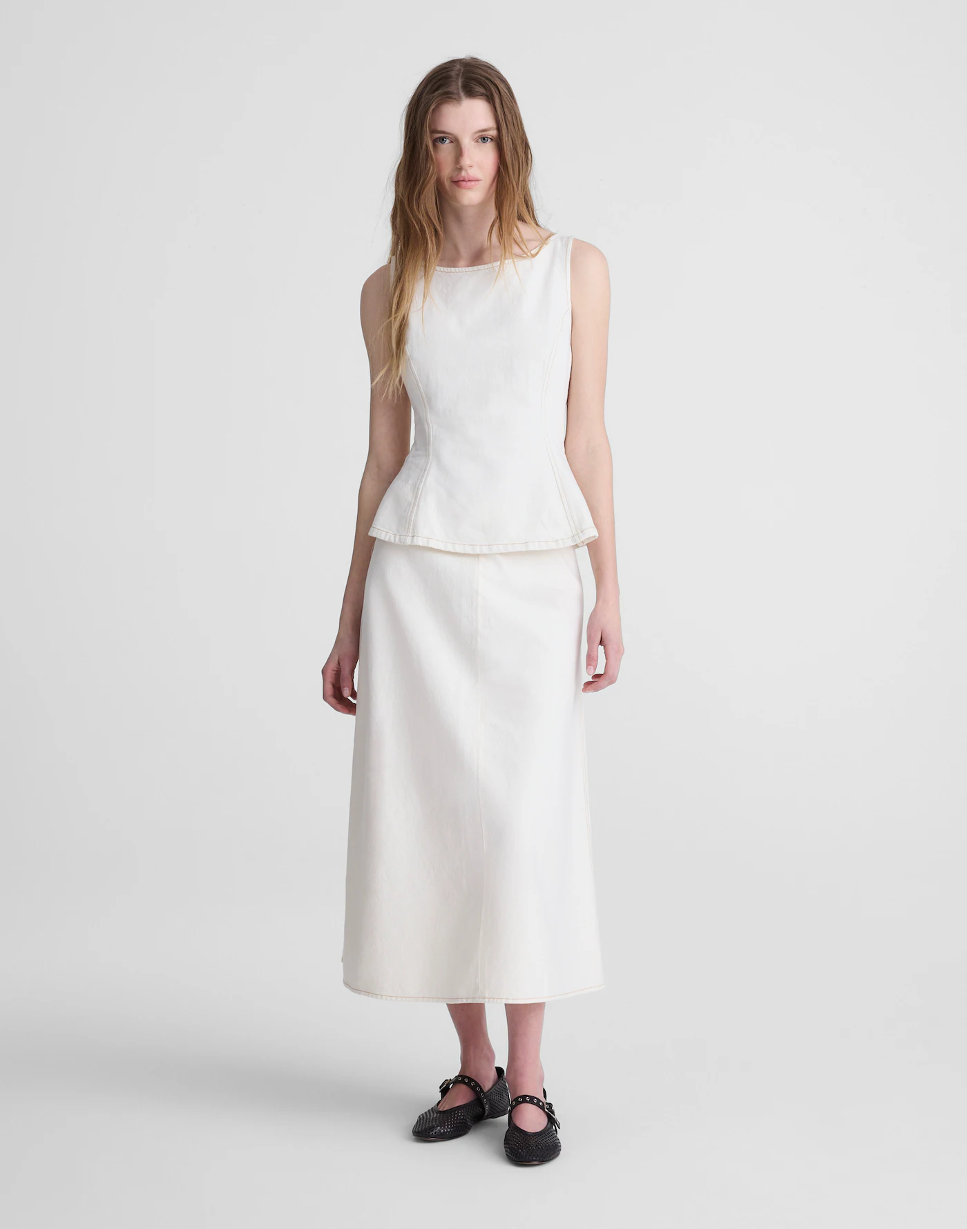 Denim Seamed Boatneck Shell Top & Slip Midi Skirt