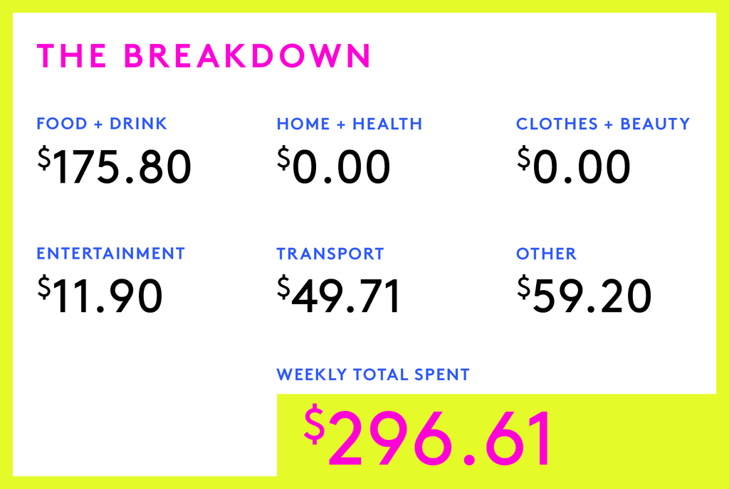 “This was a pretty typical week for me. I always spend the most on food and groceries each week. A few years ago, I was very strict about my spending, which meant I didn’t try new things or spend money on experiences. I’ve learned it is so important to have a community and things that you enjoy doing, which requires spending some money. I will now spend money on hobbies, activities, experiences, and friends, which have made my life so much better.”